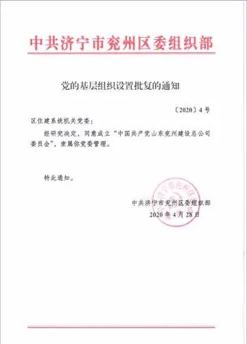 在區(qū)委組織部批準(zhǔn)山東兗州建設(shè)總公司成立黨委后,6月10日上午,中共山東兗州建設(shè)總公司委員會(huì)第一次全體黨員大會(huì)暨公司黨委成立揭牌儀式在公司隆重舉行。區(qū)委組織部副部長(zhǎng)吳占華、區(qū)委區(qū)直機(jī)關(guān)工委書記顏景軍、區(qū)住建局黨組成員、副局長(zhǎng)葛繼生、住建系統(tǒng)機(jī)關(guān)黨委專職副書記肖艷秋出席儀式。